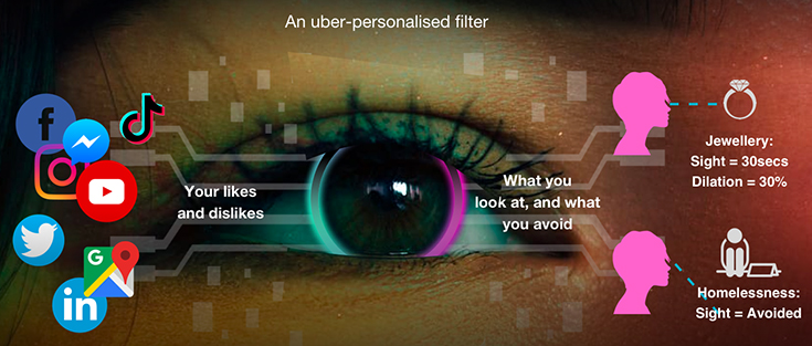 在Bengier的構(gòu)想中,140年后的未來(lái)世界,顯示屏不再是人們佩戴的眼鏡,而是成為了人體的一部分,基于植入耳后并與角膜連接的芯片進(jìn)行工作。