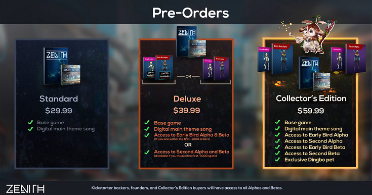 據(jù)悉,「Zenith」預(yù)售價(jià)分為29.99、39.99及59.99美元三個(gè)價(jià)格區(qū)間,其中付費(fèi)29.99美元的玩家將在游戲正式發(fā)行之后獲得「Zenith」及游戲數(shù)字主題單曲;而付費(fèi)39.99美元的玩家將能額外體驗(yàn)「Zenith」Alpha及Beta版本,值得一提的是,如果玩家是前1000名下單付費(fèi)用戶(hù),還能獲得游戲Kickstarter支持者擁有的Early Bird Alpha版體驗(yàn)資格;此外付費(fèi)59.99美元的玩家除了擁有以上預(yù)售所有內(nèi)容之外,將獲得「Zenith」收藏版、“Dingbo”寵物以及不受限制體驗(yàn)Alpha及Beta版本。