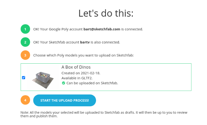 該工具的工作原理是連接Poly和Sketchfab賬戶,然后用戶可以通過(guò)一個(gè)相關(guān)頁(yè)面列表選擇需要轉(zhuǎn)移的內(nèi)容,值得注意的是,Tilt Brush及Tour Creator文件不在支持移植范圍之內(nèi)。不過(guò)Sketchfab指出,Tilt Brush用戶可以使用Tilt Brush內(nèi)置的Sketchfab Exporter將作品直接從Tilt Brush發(fā)布到Sketchfab。