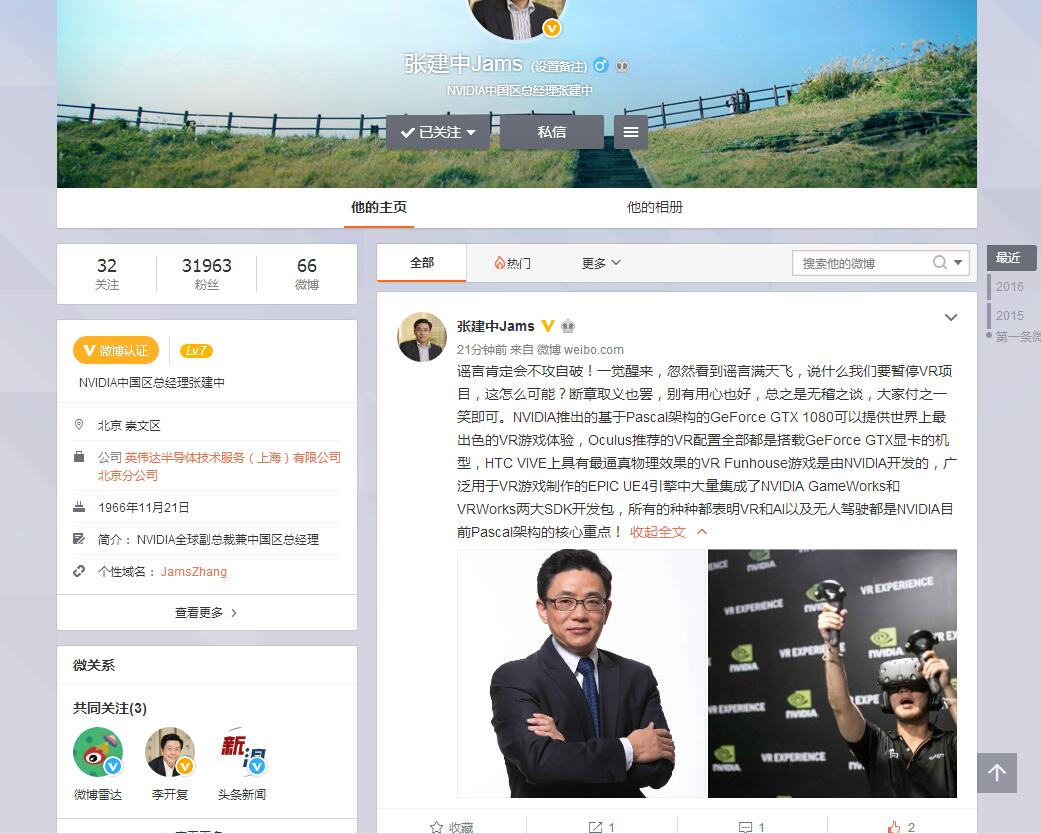 然而在今天,英偉達全球副總裁兼中國區(qū)總經(jīng)理張建中卻發(fā)表微博聲稱“英偉達暫停VR項目”的消息純屬謠言,并列舉了英偉達旗下主推的幾款廣泛用于VR領(lǐng)域的技術(shù)和產(chǎn)品,強調(diào)“VR和AI以及無人駕駛都是NVIDIA目前Pascal架構(gòu)的核心重點!”以下是微博原文: