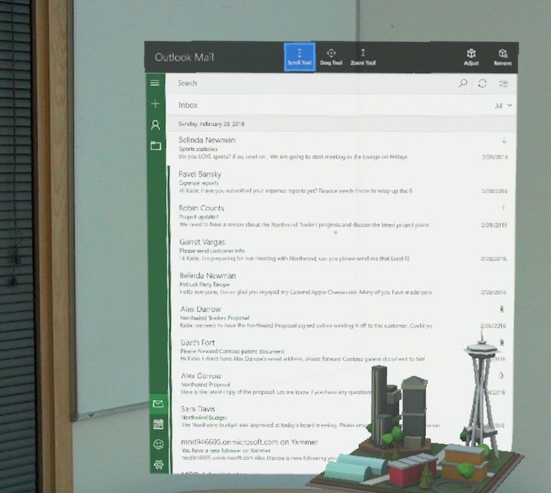 通過 Outlook Mail,HoloLens 可以將收件箱投影到辦公室墻面上,這樣用戶不僅能看到真實(shí)世界物體,還能看到 Outlook。Calendar 則會顯示日歷和當(dāng)天日程安排。