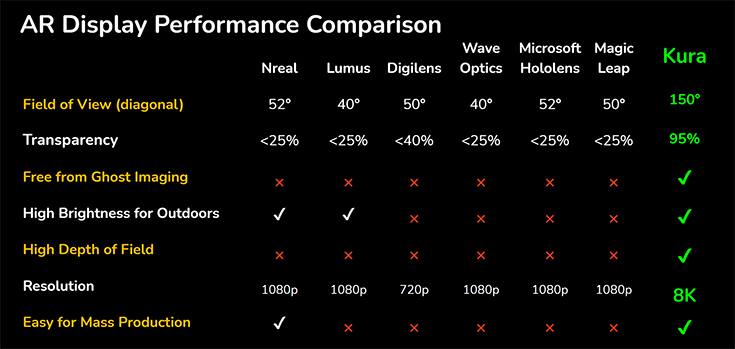 Kura官網(wǎng)的對比數(shù)據(jù)顯示,其產品在視場角(150°)、透光率(95%)、分辨率(單眼8K)等方面均大幅領先于Nreal、Lumus、Digilens、微軟、Magic Leap等競品。