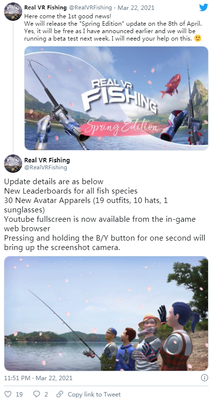 據(jù)外媒UploadVR報道,由韓國游戲工作室Miragesoft開發(fā)的VR休閑游戲「Real VR Fishing」將于4月8日推出“Spring Edition”免費(fèi)更新。