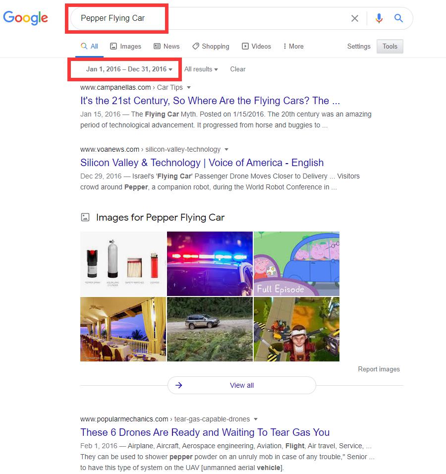 然而,通過谷歌搜索Pepper+Flying+Car關(guān)鍵詞,并限定頁面的收錄時間,并未搜索到高匹配度的信息,即使去除時間的限制,依然沒有任何有關(guān)這款飛行汽車原型的新聞。