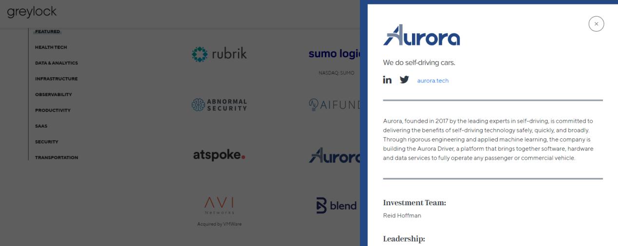 這里我們沒有查到Greylock對Kura的投資,但找到了一家名為Aurora Tech的公司。不過,Aurora Tech并非Kura的前身Aurora Tech Inc.,而是一家研究自動駕駛技術(shù)的公司,創(chuàng)立時間也是2017年,但由于雙方都牽扯到了Greylock,是否會有某種奇妙的聯(lián)系呢?