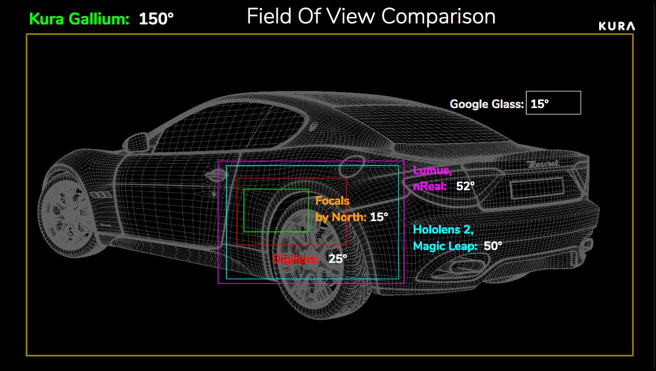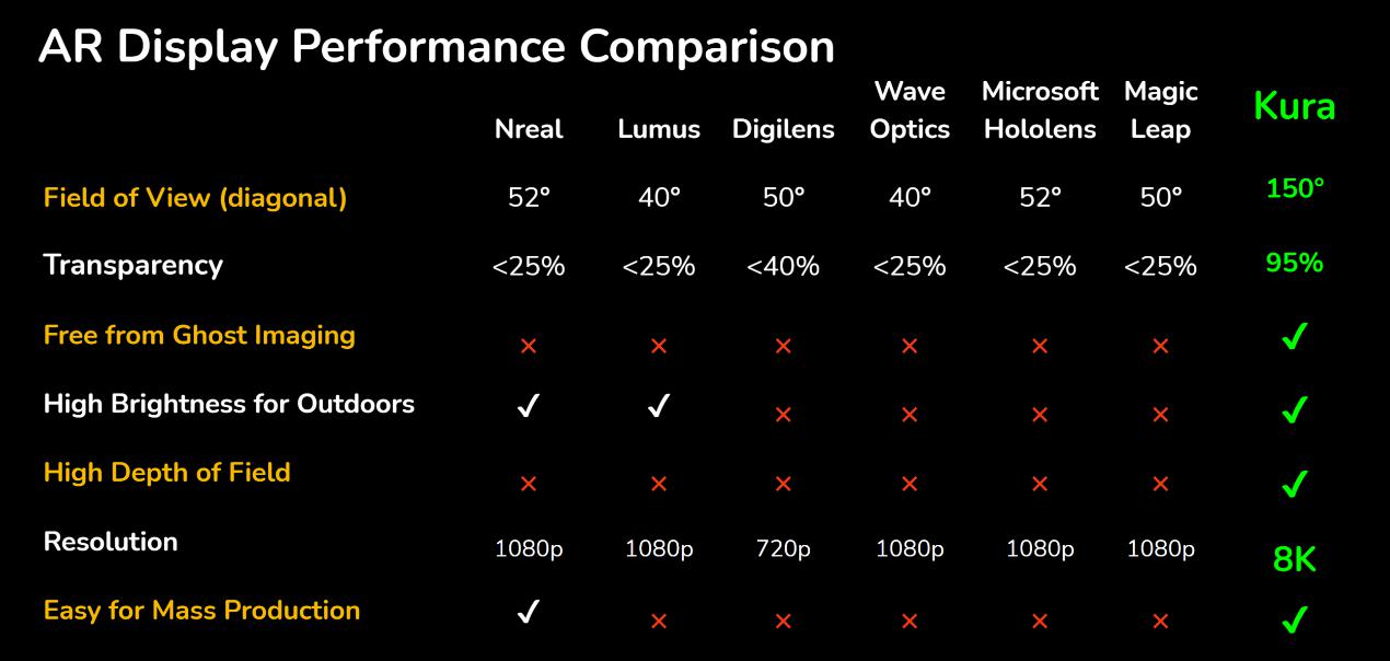 在遙遠的美國硅谷,有一家頗為神秘的AR創(chuàng)企——Kura Technologies(以下簡稱Kura),它宣稱自家的AR眼鏡能夠?qū)崿F(xiàn)8K分辨率,150°視場角(對角線),透光度更是高達95%,具備90-150FPS的計算傳輸速度,與性能足夠的PC連接時可以實現(xiàn)全幀渲染,當計算資源不足時會利用眼球追蹤的相關(guān)算法使得視場角中心進行充分渲染,從而減少計算資源的消耗。