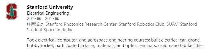 2015年,Kelly Peng申請了斯坦福大學的部分課程,涉及電氣、計算機和航空航天工程。由于Kelly Peng并沒有提到獲得過斯坦福大學的碩士學位,這部分課程可能屬于Certified Degree,也就是就讀部分指定課程并獲得特定的證書,如果類比國內(nèi)的話有點像一些大學開設(shè)的成人教育課程,課程難度有簡單有難的,但申請的難度顯然無法和碩士學位相提并論。