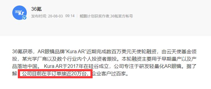 且不提對于AR硬件制造商來說,百萬美元級別的投資基本屬于杯水車薪,Kura如果真的如日前36Kr報道所述“獲數(shù)百萬美元Pre-A輪融資”,總?cè)谫Y金額應(yīng)該超過了千萬美元,在不涉及設(shè)備量產(chǎn)的情況下可能勉強還算夠用。