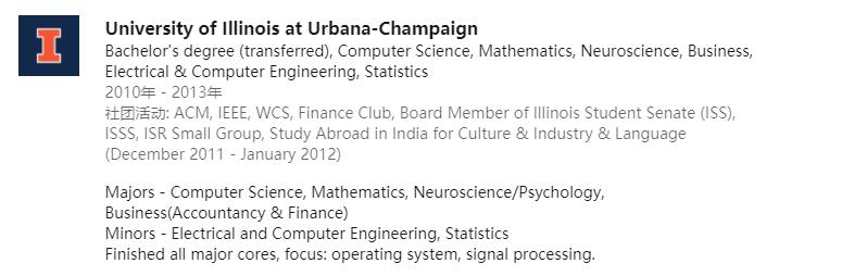2013年,Kelly Peng轉(zhuǎn)學去了一所更加牛X的學?!又荽髮W伯克利分校(UC Berkeley)就讀電氣工程與計算機科學(Electrical Engineering and Computer Science)并于2014年成功拿到學士學位。值得一提的是,伊利諾伊香檳分校和加州大學伯克利分校的EE和CS專業(yè)的確是美國頂尖,Kelly Peng能就讀這兩所大學的EE和CS專業(yè),妥妥的學霸中的學霸。