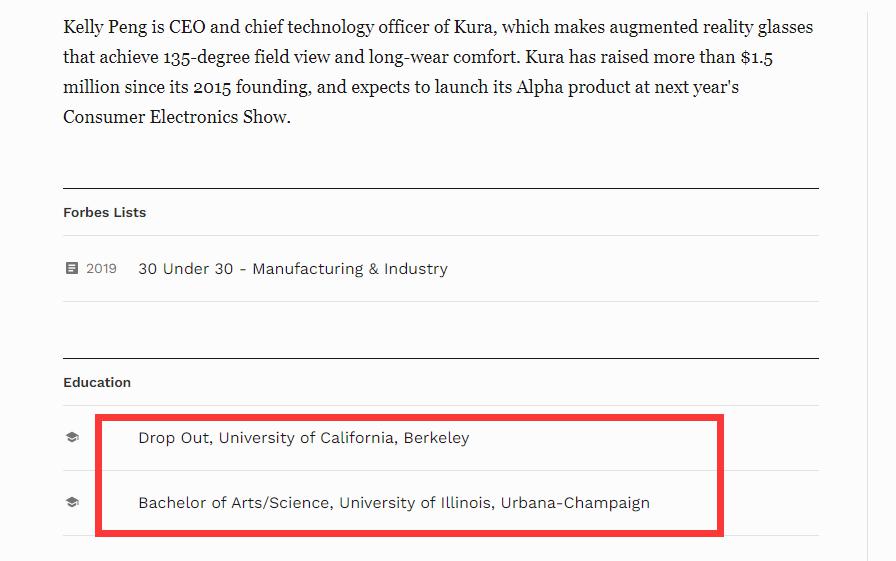 然而,在我們查閱Kelly Peng獲得的2019年福布斯「30 Under 30」榜單時,卻發(fā)現(xiàn)了一些蹊蹺之處。福布斯的資料顯示,Kelly Peng在伊利諾伊香檳分校獲得的是人文與科學的學士學位,這是一個文理科學位,而非兩所學校強悍的工科。至于加州大學伯克利分校,Kelly Peng退學了。