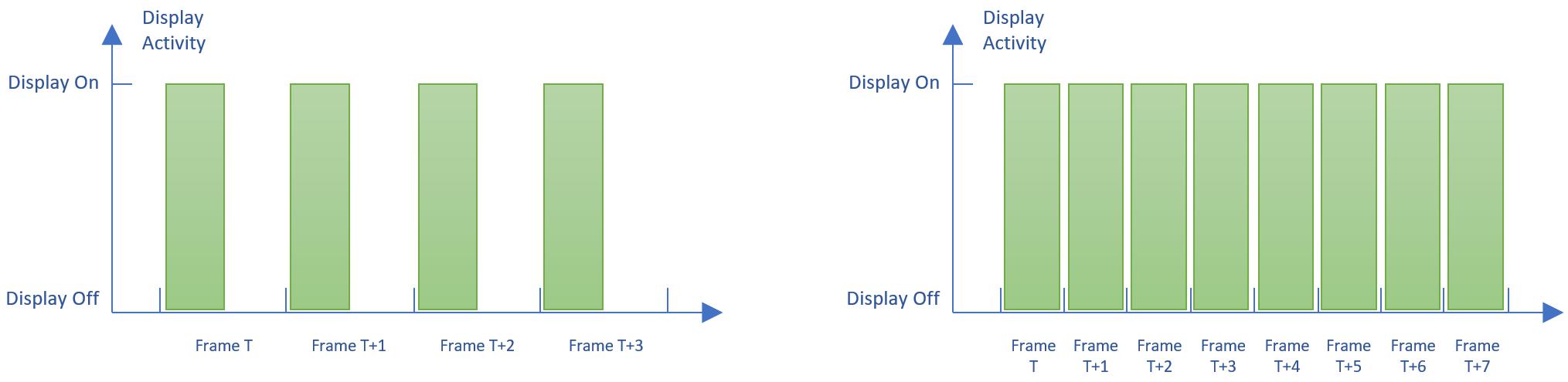 ▲綠色的長條可以看做亮度,右圖的顯示方式雖然亮度和刷新率可以達到左圖的兩倍,但會出現(xiàn)嚴重的拖影問題