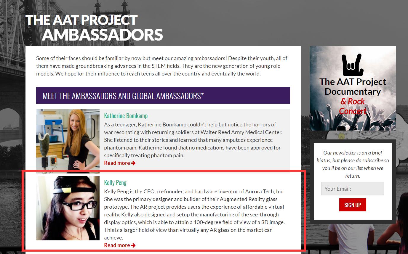 2016年7月,Kelly Peng出任AAT項目(America‘s Amazing Teens)大使。這個AAT項目是由一家商業(yè)公司進運作的,創(chuàng)立于2014年。在AAT的官網(wǎng)上,我們能夠看到Kelly Peng的簡介中清楚的寫著她是Aurora公司的CEO、聯(lián)合創(chuàng)始人、硬件發(fā)明家,同時還注明了她研發(fā)的AR眼鏡參數(shù):100°視場角。
