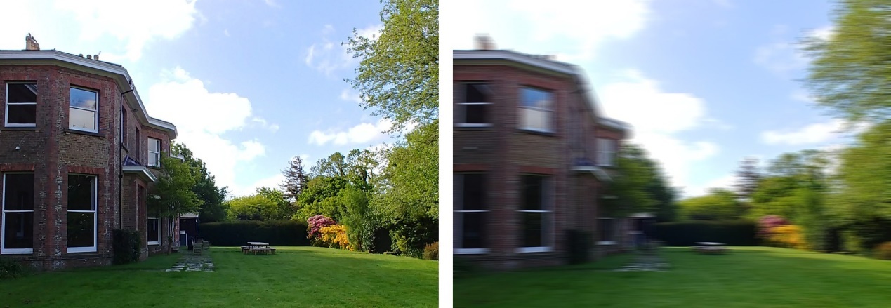 關(guān)于亮度的問題,Daniel Wagner同樣給出了詳細的解釋。簡單來說就是,為了保證畫面不出現(xiàn)拖影,AR會盡量減小固定刷新率下單個像素的工作時間。以60Hz刷新率為例,如果單個像素一直開啟,意味著該像素每一幀畫面都會工作約16ms,但如果用戶此時以每毫秒2個像素的速度轉(zhuǎn)動頭部,就會出現(xiàn)下圖右側(cè)那邊的運動模糊,因為單個像素工作16ms就會在32個像素的長度上留下拖影。
