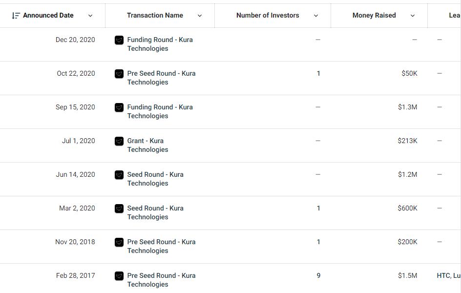 2020年3月-7月,Kura緊鑼密鼓完成3筆種子輪融資,金額分別為60萬美元、120萬美元和21.3萬美元,總計201.3萬美元。