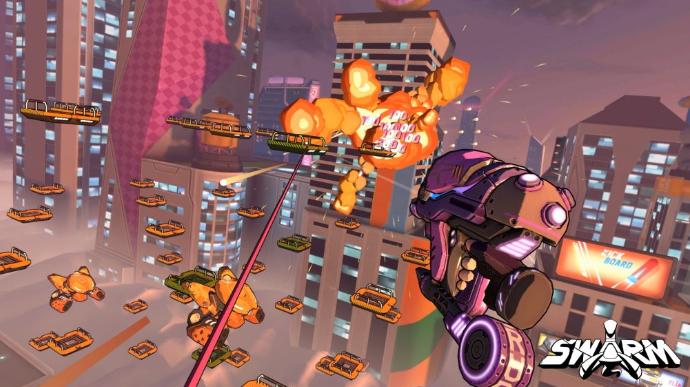 「Swarm」是一款“街機(jī)風(fēng)格”VR射擊游戲,在游戲中玩家須在巨大露天競(jìng)技場(chǎng)的飄浮平臺(tái)上憑借一對(duì)“抓鉤”及強(qiáng)大火力以消滅敵人的無人機(jī),該作過去一年一直處于測(cè)試階段,現(xiàn)在看來已準(zhǔn)備就緒。