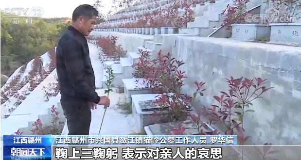 江西贛州市興國(guó)縣瀲江鎮(zhèn)貓嶺公墓工作人員 羅華信:我們這里好多外出打工人員回不來,我受村里面委托,幫他們?cè)谒麄冇H人的墓前獻(xiàn)上一束鮮花,鞠上三鞠躬,表示對(duì)親人的哀思。