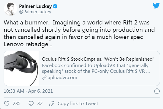 Luckey在其推特上證實(shí)了這一消息,并以此回應(yīng)“Facebook不會(huì)為Oculus Rift S補(bǔ)充庫(kù)存”的報(bào)道,他為此感到憤憤不平:“真是太掃興了!難以想象Rift 2在投產(chǎn)前被取消的原因是因?yàn)橐豢罡鸵?guī)格的‘換皮’頭顯?!?/p>