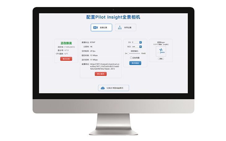 圓周率Pilot insight和Pilot Lock高性能直播相機亦支持本地Web監(jiān)控臺局域網管理模式,客戶可在瀏覽器配置直播分辨率和碼率等,直接進入全景監(jiān)控畫面。