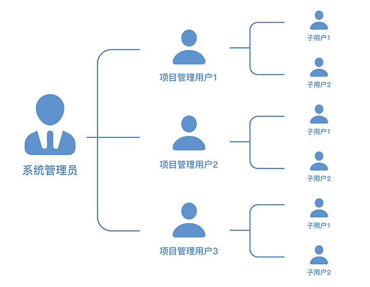 2.0眺望者提供多級權限管理與資源管理功能。系統(tǒng)管理員根據項目、區(qū)域等下設多個項目管理用戶,給每個項目管理用戶分配該項目所需的全景相機;項目管理用戶可在2.0眺望者平臺進行相機管理和實時監(jiān)控,項目管理員亦可根據職責再下設多個子用戶進行分級管理。