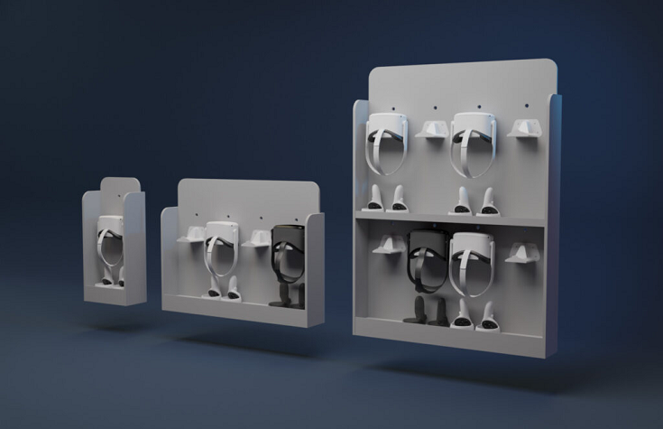 VR Powerwall系列提供了可容納“一個”、“四個”、“八個”VR頭顯的由100%PVC泡沫板制成的掛壁式充電裝置,Looking Glass XR表示:“所有VR Powerwall產品都將配備USB C 3.0充電線,‘4號’和‘8號’設備還提供了隱藏式USB充電和數據集線器?!?/p>