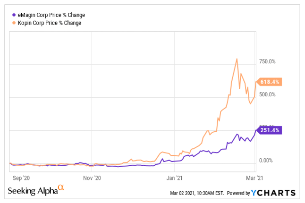 過去,高平電子和eMagin生產(chǎn)的微顯示屏主要客戶是軍方,用量相對較小,需求更偏向于定制化,但未來隨著VR/AR市場迎來井噴,可以說擁有著非常大的成長空間。這兩家美股上市公司自2020年年底以來股價(jià)一飛沖天就是最好的證明: