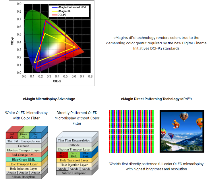 另一家Micro OLED微顯示領(lǐng)域的頂尖企業(yè)eMagin在底層技術(shù)上可能還要更勝高平電子一籌。eMagin在今年3月2日宣布,其dPd(Direct Patterning Display,直接圖案顯示)技術(shù)已獲得美國專利商標(biāo)局的認(rèn)證,去除了傳統(tǒng)OLED使用的彩色濾光片,讓屏幕的顯示亮度和色彩大幅度提升,可實(shí)現(xiàn)數(shù)字電影新方案DCI-P3標(biāo)準(zhǔn)的色彩要求。