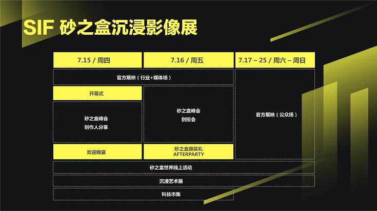 SIF 2021將設置主題峰會、官方展映、沉浸藝術(shù)展、創(chuàng)投單元、市集與砂之盒頒獎禮等六個主單元,主題峰會環(huán)節(jié)將邀請到海內(nèi)外行業(yè)大咖,針對新內(nèi)容、新技術(shù)等行業(yè)熱門話題進行深入交流,官方展映將在超過3000平的展映空間中,為觀眾帶來50余部展映作品,并對其中大部分作品進行裝置化設計。而作為歷屆SIF的重要環(huán)節(jié)之一,創(chuàng)投單元將邀請到入圍2020年砂盒計劃的孵化團隊以及通過征集入選創(chuàng)投單元的原創(chuàng)團隊來到現(xiàn)場,SIF主辦方還將為到場嘉賓準備豐富的社交活動。