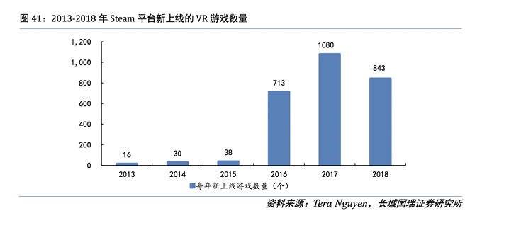 以游戲為例,根據(jù)Tera Nguyen統(tǒng)計數(shù)據(jù),截至2019 年3 月12 日,Steam上的 VR游戲總數(shù)已超過2700 款,爆款VR游戲《Beat Saber》和《Half-Life:Alyx》為Steam吸引了大量VR用戶,20年開售的半衰期預(yù)售數(shù)量超過30萬套。