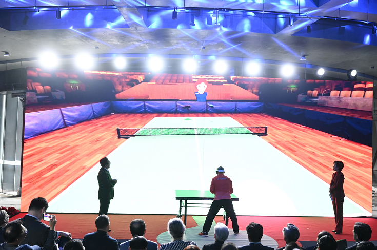 活動現(xiàn)場,除了重溫1971年那一重要歷史時刻之外,免不了的就是,雙方再切磋兩局。作為“乒乓外交”親歷者,中國乒乓球運動員梁戈亮和美國乒乓球運動員朱蒂通過5G+虛擬現(xiàn)實技術(shù),進行了一場隔空VR乒乓友誼比賽。