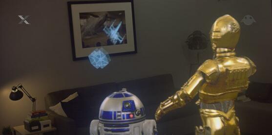 這個場景看起來發(fā)生在《星球大戰(zhàn)3:絕地大反攻》和《星球大戰(zhàn):外星一對寶》期間,機器人 C-3PO 和 R2-D2 站在一個日常生活的房間考察一副全息地圖。雖然在會議上只是顯示為一個普通視頻,但用戶可以通過AR眼鏡查看這個項目,看到的虛擬物品如同出現(xiàn)在現(xiàn)實世界中。在場景里我們可以看到星戰(zhàn)中標(biāo)志性的飛船在房間里飛行。