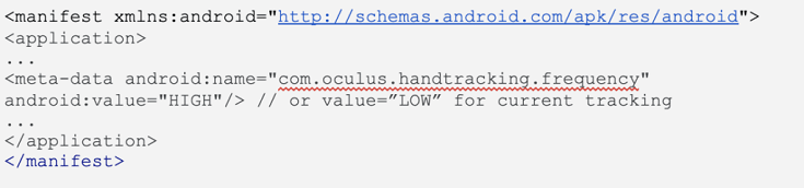 目前Quest 2開發(fā)者可以通過添加以下命令行至Android manifest以啟用高頻手勢追蹤模式: