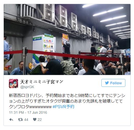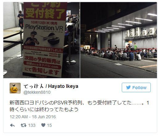 這張照片是在星期天凌晨2點池袋商業(yè)區(qū)山田電機(Yamada Denki)門口拍攝的。山田電機只得到了280個PSVR的預售名額,卻已經(jīng)有七八個人為此露營等候了。