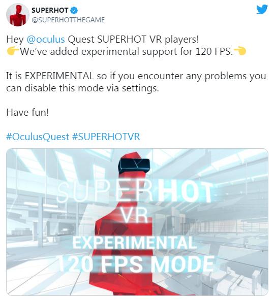 據(jù)悉在Quest 2“120Hz”模式下運(yùn)動(dòng)中的物體移動(dòng)更流暢、游戲運(yùn)行更穩(wěn)定,值得一提的是,盡管「Superhot VR」兼容“120Hz”模式,但SUPERHOT Team提醒這只是一項(xiàng)實(shí)驗(yàn)性功能,如果玩家在游戲中遇到了問(wèn)題,請(qǐng)通過(guò)游戲設(shè)置功能停用該模式。