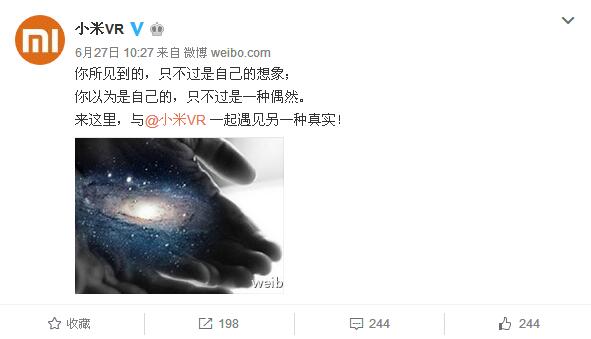 6月27日,小米官微發(fā)布了首條微博:“你所見到的,只不過是自己的想象;你以為是自己的,只不過是一種偶然。來這里,與@小米VR 一起遇見另一種真實!”從話語中隱約感受到,似乎發(fā)布會即將到來!