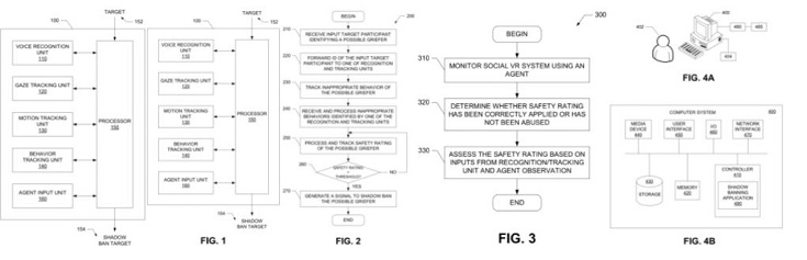這項(xiàng)名為“VR社交Shadow banning”(Shadow banning in social VR setting)的專利最早由Game Rant發(fā)現(xiàn),該專利支持索尼追蹤PSVR玩家在游戲中的行為以及對(duì)其實(shí)施禁令,相比傳統(tǒng)游戲開(kāi)發(fā)者基于玩家的言語(yǔ)(無(wú)論是文本還是語(yǔ)音聊天)來(lái)禁言玩家,VR游戲則由于沉浸式技術(shù)的物理特性使得在VR環(huán)境中禁言玩家是一個(gè)非常復(fù)雜的過(guò)程。