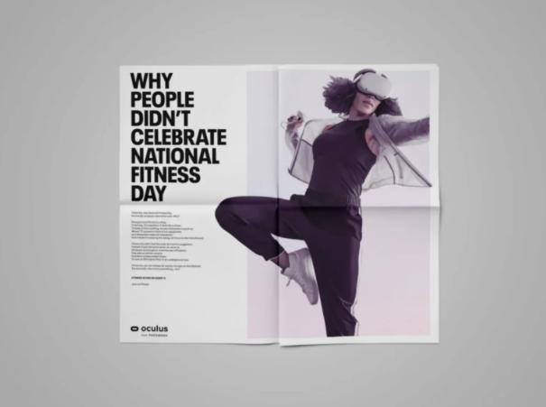其中最著名的是刊登在「紐約時報」周日版的雙頁整版廣告,廣告顯示了一名正在使用Quest 2進行健身的女士,這則廣告標(biāo)語為“為什么人們不慶祝全民健身日?”,該廣告清晰表達(dá)了Quest 2可以作為一款全民健身設(shè)備,以及相比傳統(tǒng)健身人們通過Quest 2參與鍛煉所帶來的各種益處。