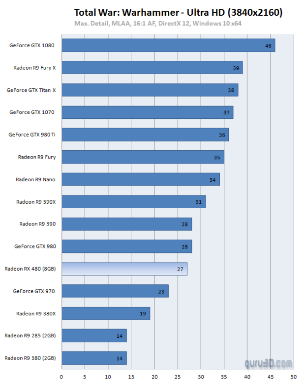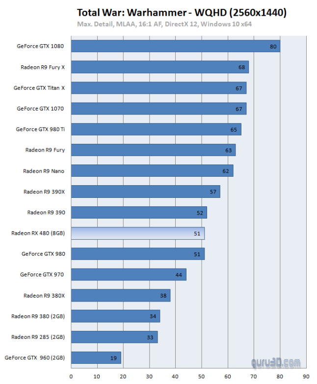 測評網(wǎng)站 Guru3D 放出該顯卡的一個評測結(jié)果,測試過程分別對《全面戰(zhàn)爭 : 戰(zhàn)錘》進(jìn)行幾種分辨率的測試,單個 RX 480(8GB) 跑分介于 GTX 970 和 980 之間,分?jǐn)?shù)更接近 980。雖然我們沒有看到 4GB 和 8GB 的對比測試,但 AMD 確認(rèn) 4GB 的 RX 480 可以達(dá)到 Oculus Rift 和 Steam VR-ready 的要求。