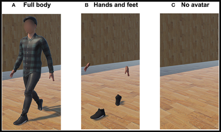 據(jù)悉,研究人員將實驗者分為三組,其中A組顯示實驗者包括手、腳部在內(nèi)的全身VR化身;B組只能看到手、腳部;C組則沒有虛擬形象。