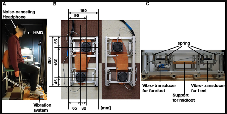 值得一提的是,每名實驗者的腳都放置在由鋁制框架、振動傳感器、丙烯酸板、彈簧和木板組成的觸感設(shè)備之中,在VR環(huán)境里該設(shè)備會分別振動實驗者的前后腳跟,以在虛擬現(xiàn)實中創(chuàng)造運動感。