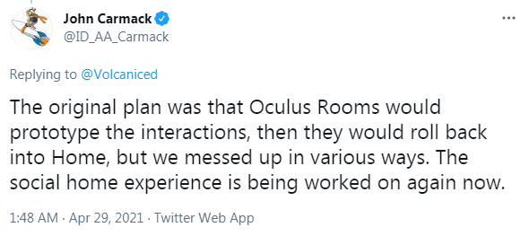 卡馬克上月末發(fā)布的一條推文證實(shí)了這一消息,推文顯示Facebook原計(jì)劃在Oculus Rooms開啟多人互動(dòng)功能,之后將社交功能應(yīng)用于Oculus Home,但這一切因種種原因而“搞砸了”。