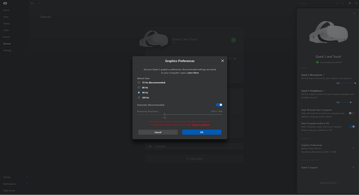 要開啟120Hz Air Link功能,Quest 2用戶首先要將Quest 2連接(Link或Air Link模式)至PC;其次,點(diǎn)擊PC Oculus應(yīng)用、單擊“設(shè)備”按鈕并選擇當(dāng)前已連接的Quest 2;最后,單擊右菜單的“Graphics Preferences”按鈕,即能看到120Hz選項(xiàng)。