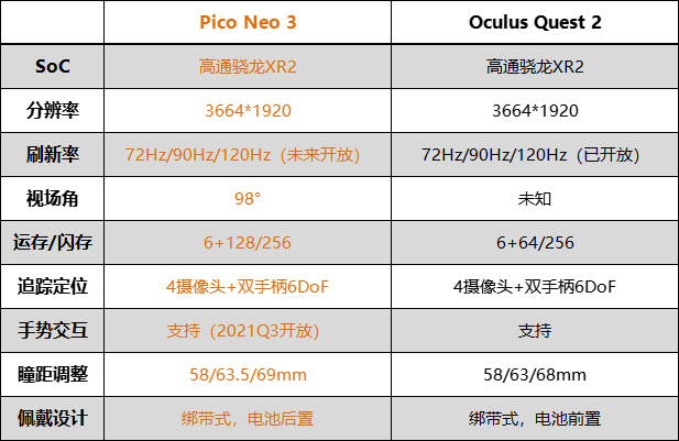 ▲Pico Neo 3 & Oculus Quest 2主要參數(shù)對比