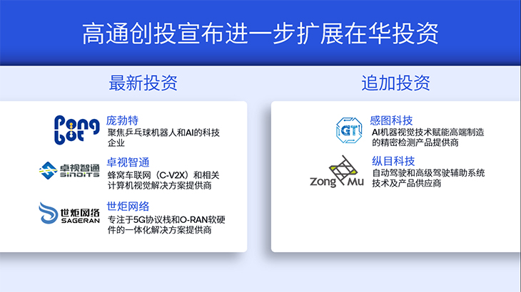 2021年5月21日,2021高通技術(shù)與合作峰會在北京水立方舉行。會上,高通創(chuàng)投宣布對五家中國公司的風(fēng)險投資,其中包括對聚焦機(jī)器人和人工智能(AI)的科技企業(yè)龐勃特、蜂窩車聯(lián)網(wǎng)(C-V2X)和計(jì)算機(jī)視覺相關(guān)解決方案提供商卓視智通、專注于5G協(xié)議棧和O-RAN軟硬件的高科技企業(yè)世炬網(wǎng)絡(luò)的全新投資,以及對泛半導(dǎo)體領(lǐng)域工業(yè)AI解決方案提供商感圖科技、自動駕駛和高級駕駛輔助系統(tǒng)解決方案供應(yīng)商縱目科技的追加投資。