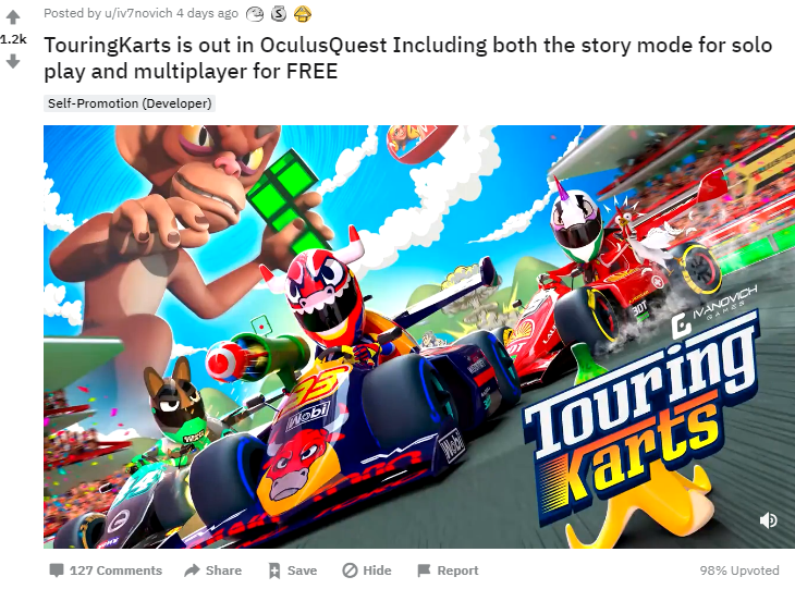 據(jù)外媒UploadVR報(bào)道,近日,由西班牙游戲工作室ivanovich games開(kāi)發(fā)的VR賽車(chē)游戲「Touring Karts」登陸App Lab平臺(tái)。
