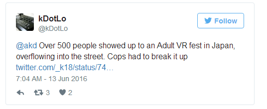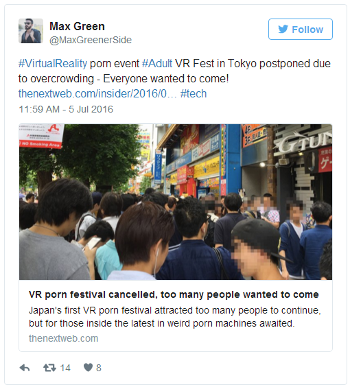 外媒VRTalk就描述了此次島國成人VR展的“盛況”:想要觀看色情VR的觀眾們還沒來得及擠進會場,就被場外一陣騷亂給拒之門外。