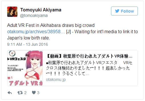 上月初,在島國秋葉原區(qū)(Akihabara district venue)開辦的Adult VR Fest 01(成人VR展)就因為參加的游客實在太多了,在僅僅開場15分鐘后就被迫選擇關(guān)閉。不過,這次成人VR展僅僅開放了15分鐘的展會上出現(xiàn)了許多想象力豐富的成人VR產(chǎn)品,用戶甚至可以各種方式,和VR中的成人場景進行各種互動。現(xiàn)場真是各種“不要不要”的羞恥play場面。