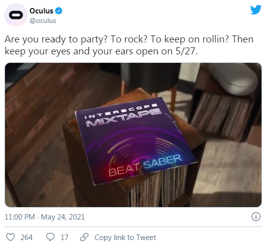 此外Oculus官方推特也發(fā)布了一段視頻,視頻顯示了名為“Interspace Mixtape”的「Beat Saber」黑膠唱片專輯,專輯發(fā)布時(shí)期為5月27日,該專輯收錄了歌手Kendrick Lamar及流行樂隊(duì)LMFAO的歌曲。