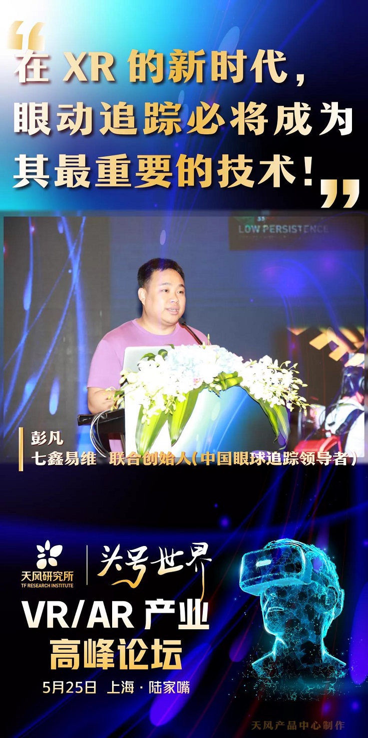國內(nèi)眼球追蹤技術(shù)開創(chuàng)企業(yè)七鑫易維聯(lián)合創(chuàng)始人彭凡,受邀出席會議并就當(dāng)前全球虛擬現(xiàn)實發(fā)展動向提出:“在XR時代,眼球追蹤必將成為其最重要的技術(shù)!XR時代就是眼動時代!”