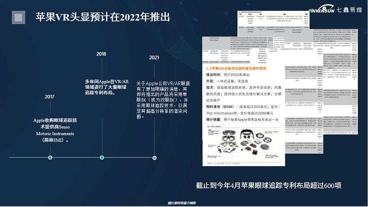 七鑫易維聯(lián)合創(chuàng)始人彭凡在演講現(xiàn)場以數(shù)據(jù)的形式呈現(xiàn)了未來全球虛擬現(xiàn)實市場的體量,也總結(jié)了大廠進(jìn)行虛擬探索的腳步,以蘋果公司為例,為大家呈現(xiàn)出眼球追蹤技術(shù)在虛擬現(xiàn)實技術(shù)發(fā)展中不可或缺的理由。