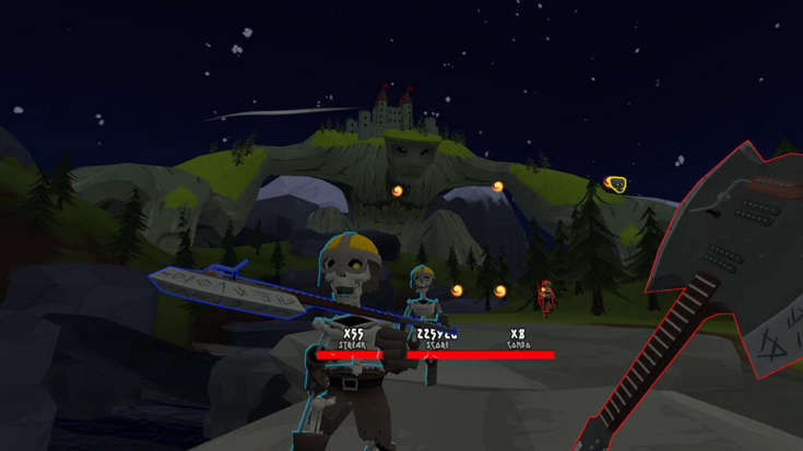 「Riffs God」特別之處在于游戲中玩家將能揮舞兩把戰(zhàn)斧形狀的吉他,并隨著重金屬音樂節(jié)奏敲擊迎面而來的骷髏頭骨及骷髏怪物。